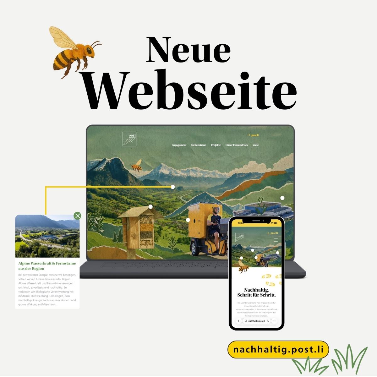 Schritt für Schritt bewegt sich die Liechtensteinische Post damit in Richtung noch mehr Nachhaltigkeit. Getreu dem Motto: gelb im Herzen, grün im Denken. Auf der neuen Webseite informiert die Liechtensteinische Post transparent und aktuell über die Ziele und Schritte hin zur Klimaneutralität.
